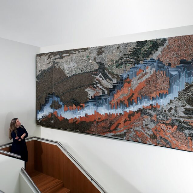 À plusieurs reprises, Élise Morin a travaillé sur notre rapport aux technologies. En 2017, elle réalise Data Mining Panorama, un bas-relief composé de métaux ferreux et non ferreux, de plastiques et de cartes électroniques provenant du déchiquetage des ordinateurs de la City à Londres, première place financière du monde.